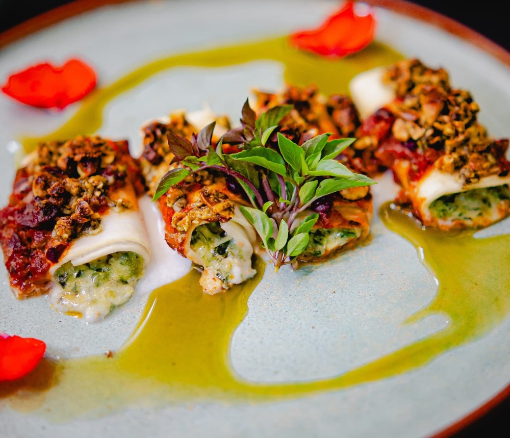 castanhas. Leve ao forno por 20 minutos e mais 5 minutos em uma salamandra para gratinar. Decore com folhas de manjericão.